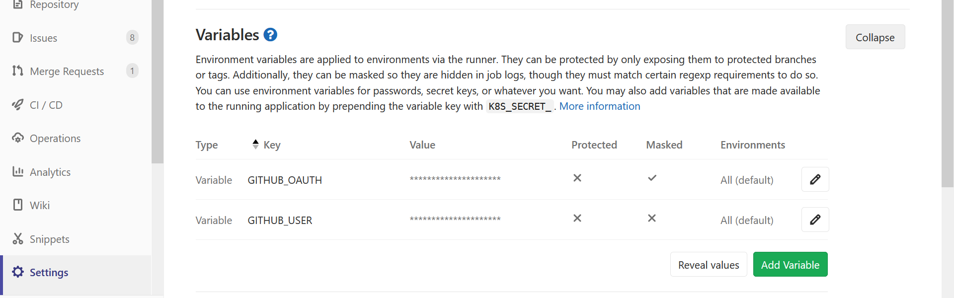 Go to your project’s page on Gitlab and go to the Settings -> CICD menu. There, expand the “Variables” section. You are going to create 2 variables: