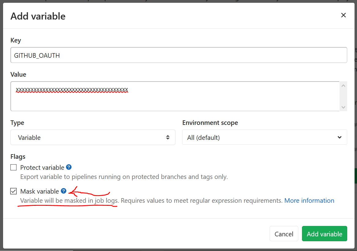 When you create the variable containing your token, YOU NEED TO CHECK THE “Mask Variable” BOX. This will prevent your token from leaking in the Job output.
