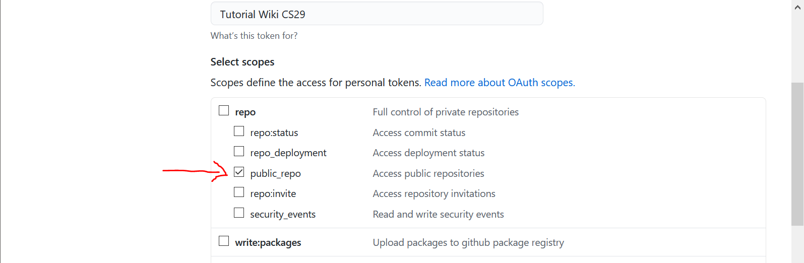 Then, you need to decide which actions are permitted with this token. Check the boxes that you need, and only those. These tokens are a potential security risk. You do not want to give unnecessary accesses. In our case, we want to be able to push to a repository which is public. So we only need to check the public_repo box.